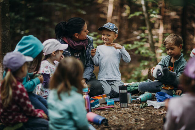 Vor dem Essen werden die Kinder ruhig und lauschen auf die Töne des Waldes. Wir warten bis alle sitzen und ausgepackt haben. Gemeinschaft und gegenseitige Rücksichtnahme ist uns sehr wichtig. Deshalb beginnen wir die Brotzeit mit dem Ritual des Brotzeitspruches und beenden sie, wenn alle fertig sind, indem die Kinder selbständig einpacken und fragen, ob sie aufstehen dürfen. In der Brotzeitrunde ist Zeit für Gespräche, Entspannung und kleine Vorlese- oder Märchenrunden.