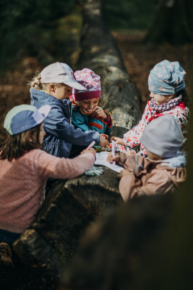 Nichts anderes machen Kinder ohnehin von sich aus im Spiel, wenn wir Erwachsene sie lassen. Unsere Aufgabe als Naturraumpädagogen sehen wir darin, die Interessen der Kinder zu beobachten, Interessensschwerpunkte zu bündeln und mit den Kindern daraus Wissensfragen zu entwickeln. Daher passiert alles Lernen bei uns im Wald aus dem Moment heraus. Nicht geplant.